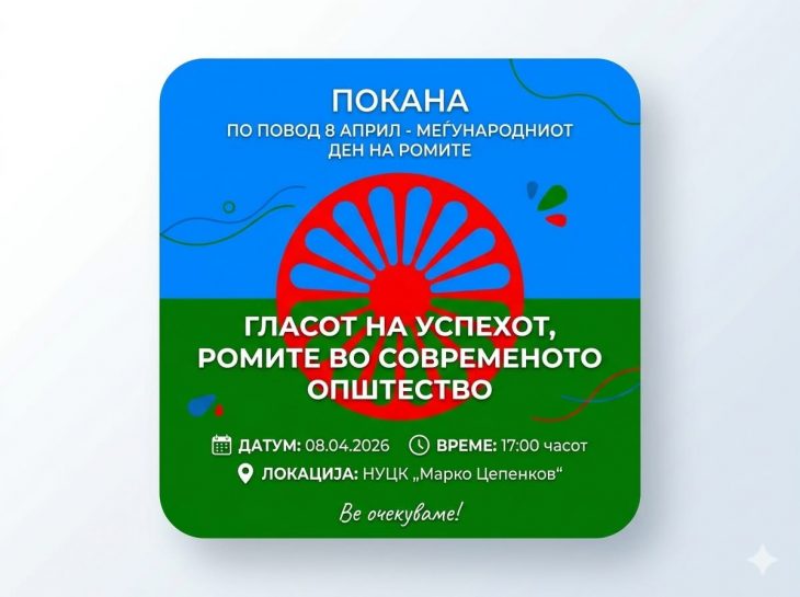Општина Прилеп организира настан „Гласот на успехот – Ромите во современото општество“ по повод одбележувањето на 8 Април, Меѓународниот ден на Ромите. Настанот ќе се одржи утре, 08.04.2026, со почеток од 17:00 часот во НУЦК „Марко Цепенков“.
